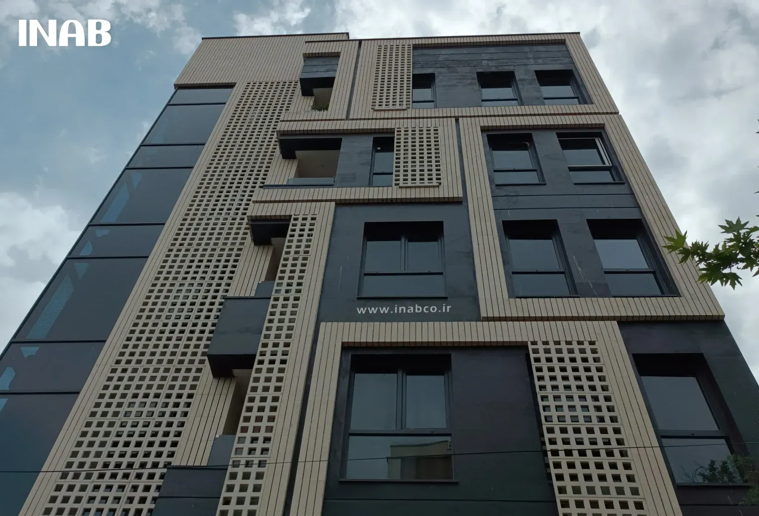 في واجهة هذا المشروع، تم استخدام مزيج من ألواح GFRC من إيناب بنمط “هاموني” بأبعاد 100 × 50 سم وبألوان فاتحة، بالإضافة إلى الزجاج المدخن، مما منح المبنى مظهرًا حديثًا ومينيماليًا.