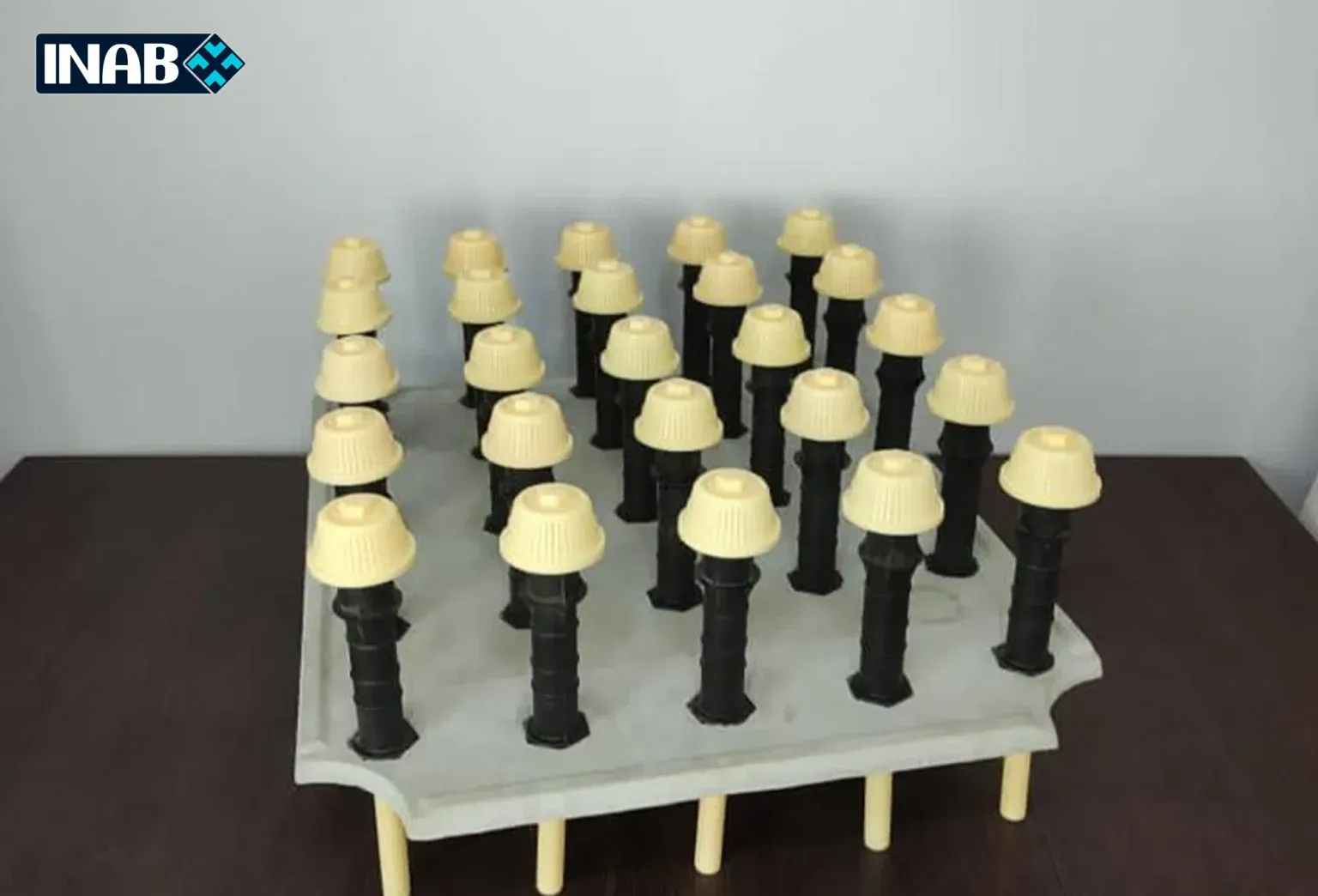 - The nozzle shafts are installed in the designated slots within the GFRC molds, and protective caps are placed over the shafts.