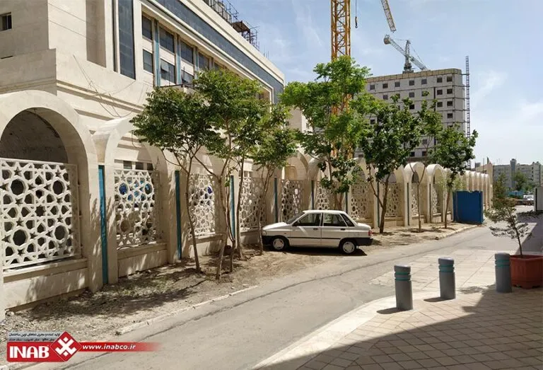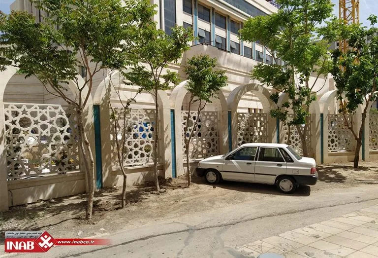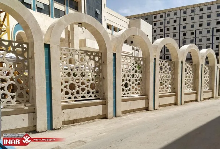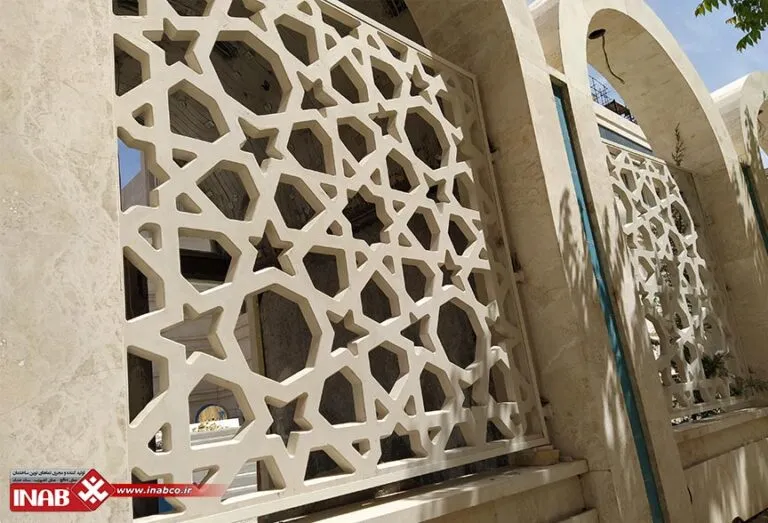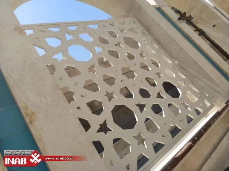 The INAB GFRC panels with the Anamis design, measuring 220×220 cm and 190×190 cm, are a custom product by INAB featuring a lattice design inspired by traditional Iranian architecture. This design adds a beautiful, authentic, and lasting visual effect to architectural spaces. Beyond aesthetics, the lattice pattern gives the space a distinctive ambiance that aligns with classical Iranian architecture, providing a unique character. These panels were specially designed for the Imam Reza Hotel to create an attractive environment that reflects Iranian cultural elements.