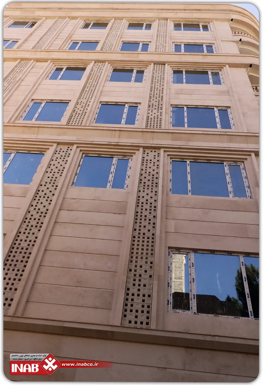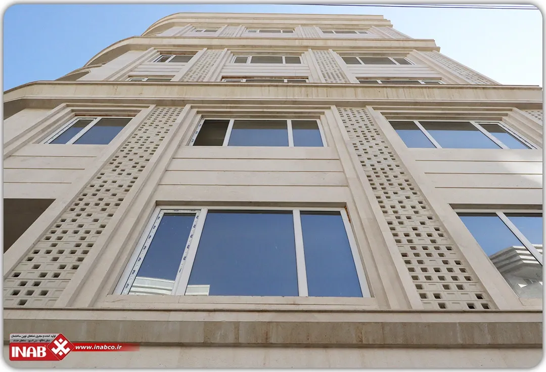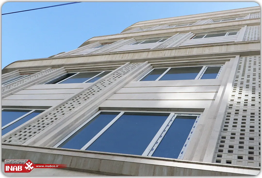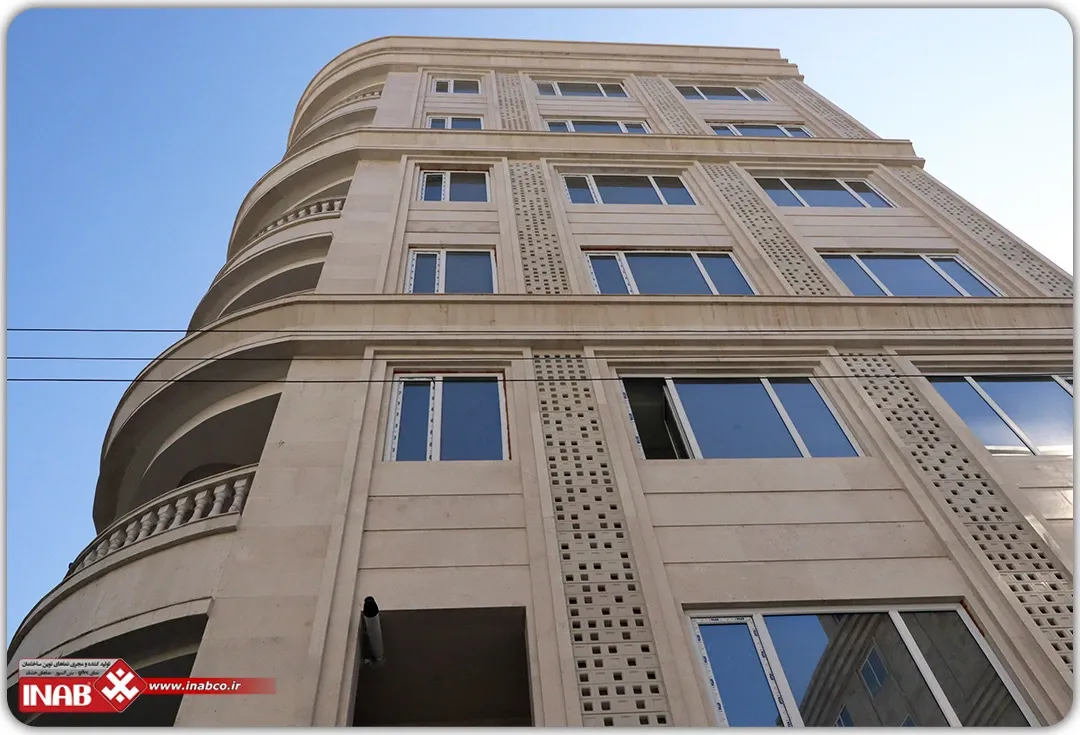 The combination of these panels with natural travertine stone not only enhances visual aesthetics but also improves the building’s thermal and acoustic insulation. The installation of this design was carried out using INAB’s proprietary system, which, by utilizing metal screws and scopes, allowed for faster and more precise panel installation. This system also creates a protective layer that prevents moisture and dirt from penetrating behind the panels, thereby extending the building’s lifespan.